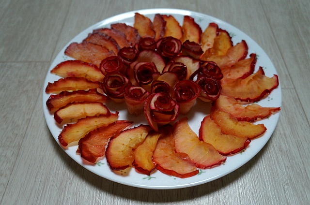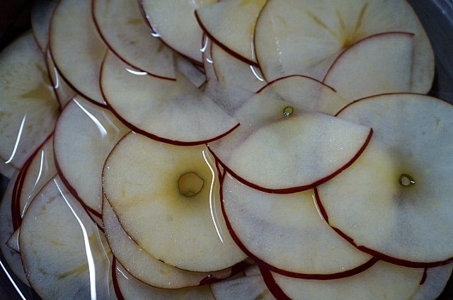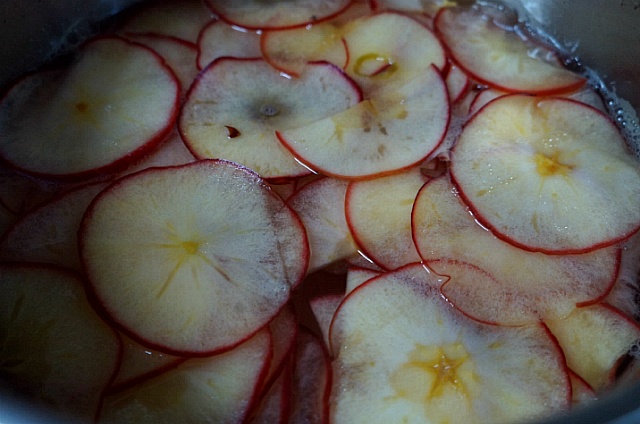 홍옥을 얇게 썰어 설탕물에 담가 놓으면서 작업을 했습니다.