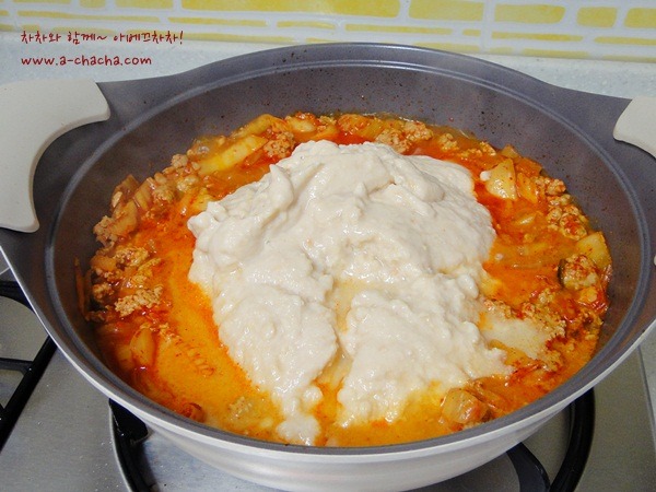 콩비지 1봉지(320g), 배추김치 2줌, 돼지고기 갈은 것 300g, 대파 약간, 멸치다시마 육수