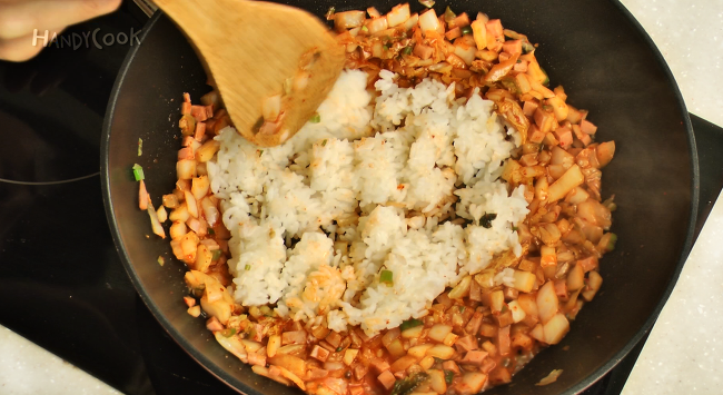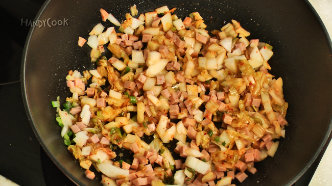 - 중불로 달군 팬에 식용유를 두르고 다진 파를 넣고 볶다가 김치를 넣고 볶은 뒤 햄과 양파를 넣고 1분간 볶는다.