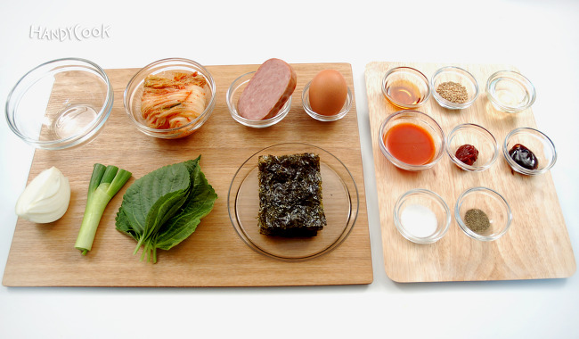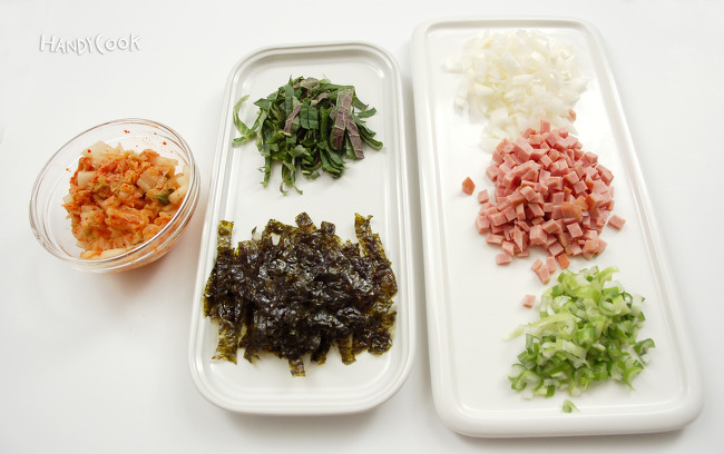 - 배추김치는 잘게 썰고 양파는 굵게 다진다. 햄도 잘게 썰고 대파는 굵게 다진다. 깻잎은 길이로 반을 잘라 채 썰고 김은 가위로 채 썰어 준비한다.