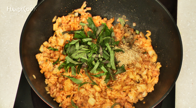 - 센불로 올려 양념을 넣고 볶다가 밥을 넣고 고루 섞으며 볶는다.