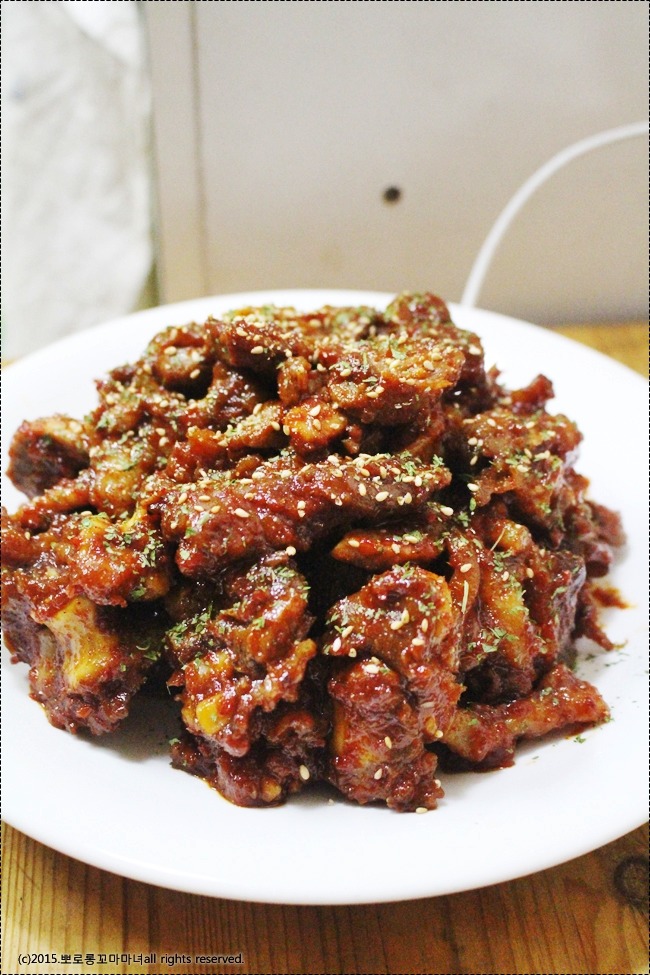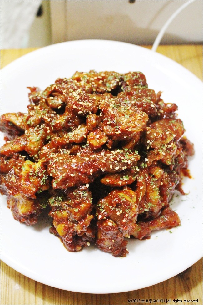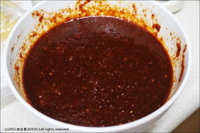 양념 : 고추장 1큰술, 매실청 1큰술, 고추가루 4큰술, 양파 1/3개+마늘 10알 간것, 간장 5큰술, 올리고당 5큰술, 설탕2큰술, 청주 2큰술, 물 적당량