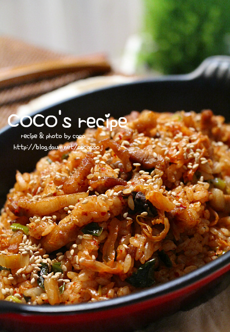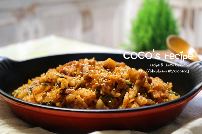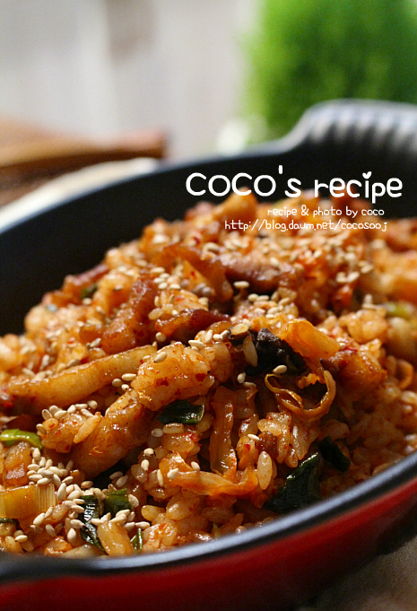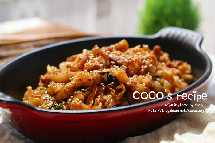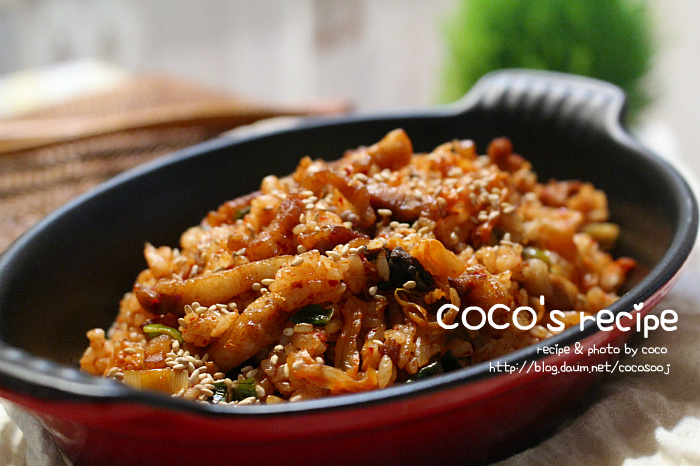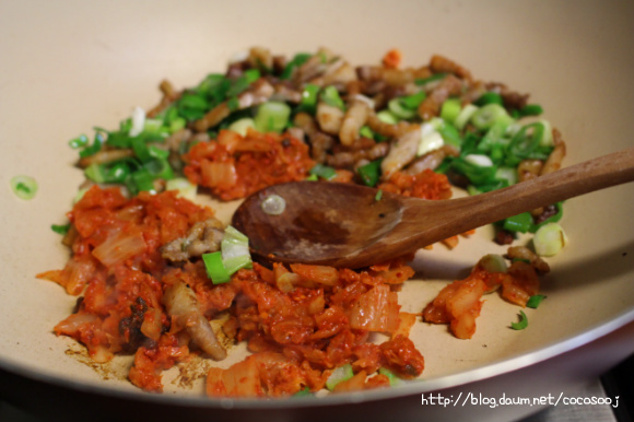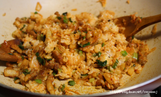 김치가 어는정도 복아지면 따끈한 밥을넣어 같이 볶아주시구