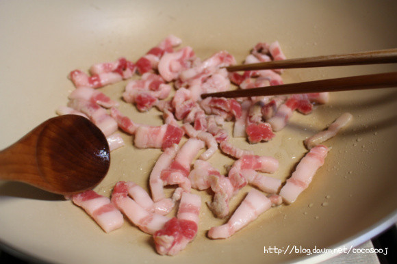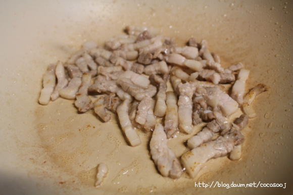 먼저 오일을 아주 조금 두른팬에 삼겹살을 먼저 볶아주세요~