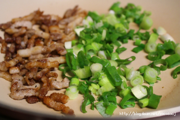 말끔해진 팬에 구워두었던 삼겹살 올리시고 파를 함께넣어 볶아주세요~