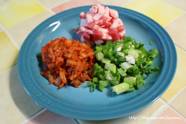 재료: 삼겹살 100g, 김치 100g, 중파 1대, 밥 1공기, 소금·참기름 조금씩.