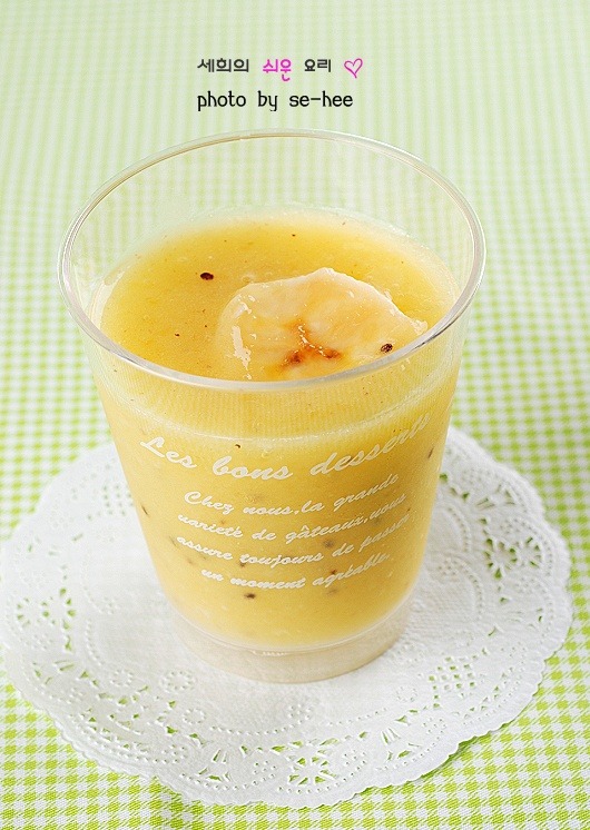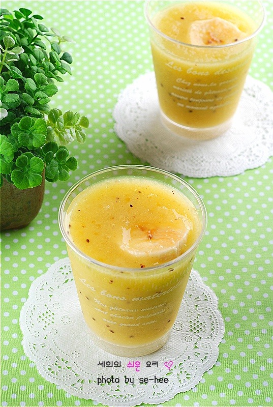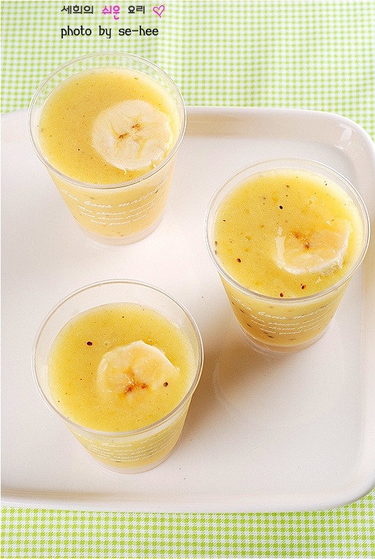 이 음료는 골드 키위로 만들었어요.아울러 바나나는 껍질을 벗긴 후 레몬즙을 살짝 뿌려주면 갈변을 방지할 수 있어요.