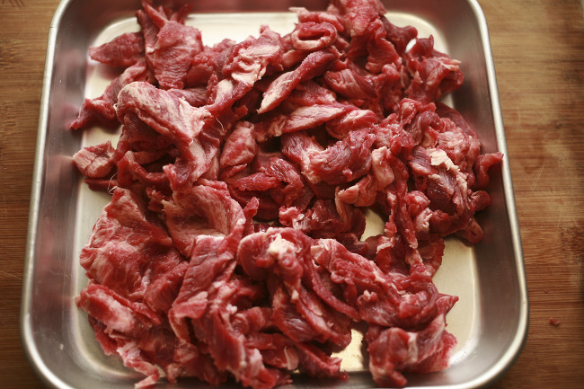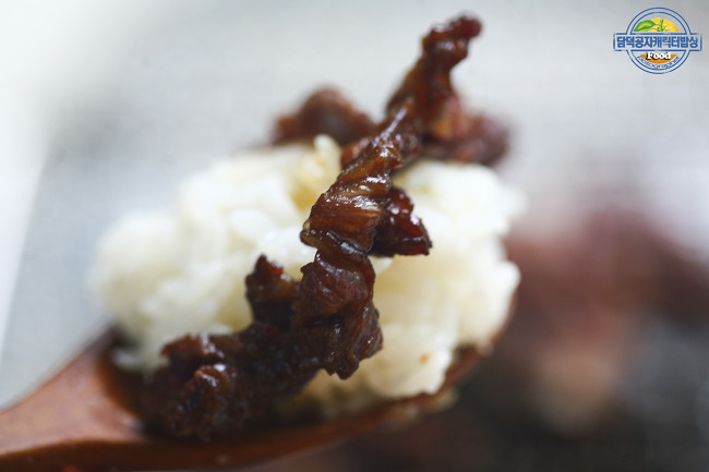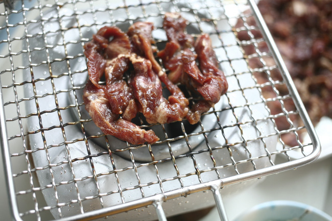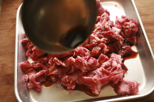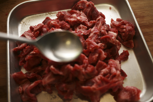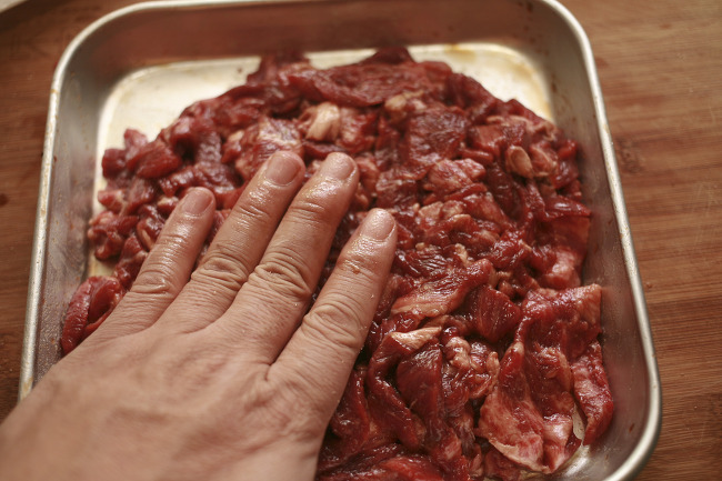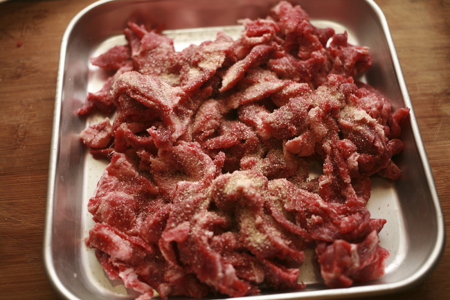 저며 썬 소고기위에 설탕을 뿌려줍니다.