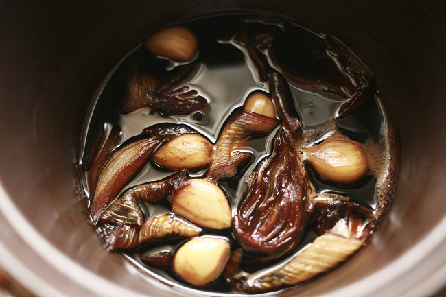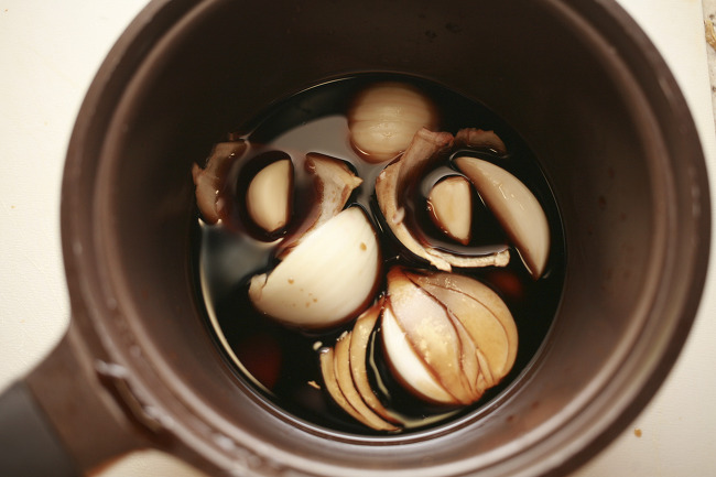 양파1/2쪽, 마늘6알, 대파1/2쪽, 생강, 간장10숟가락, 미림4숟가락