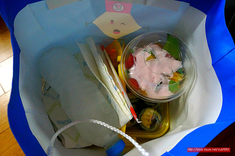 김밥,소시지,새우튀김,갈비만두,치킨너겟을 담아줍니다..^^