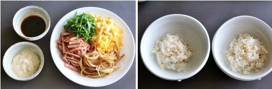 밥 2공기, 달걀 3개(우유 1큰술,맛술 1/2큰술, 소금 1/8작은술),