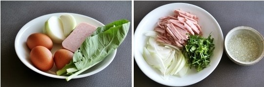 양파 150g, 저염스팸 150g, 케일잎 2장, 식용유 약간
