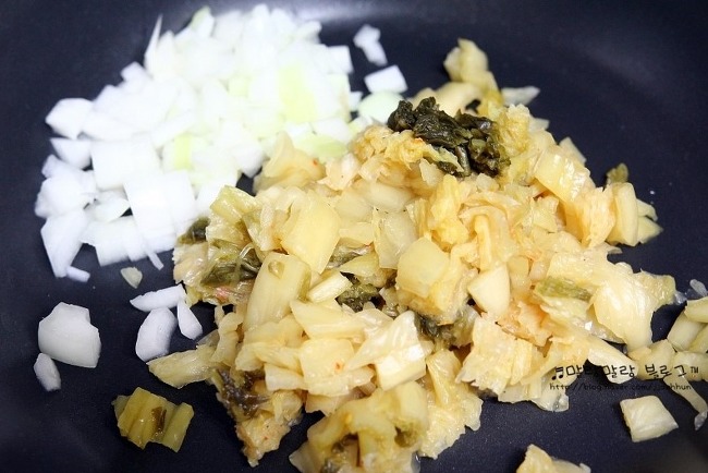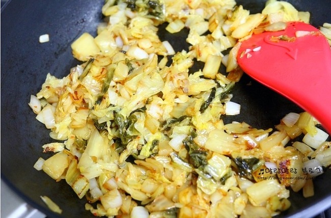 쫑쫑 썰은 김치와 양파에 들기름과 설탕을 조금씩!