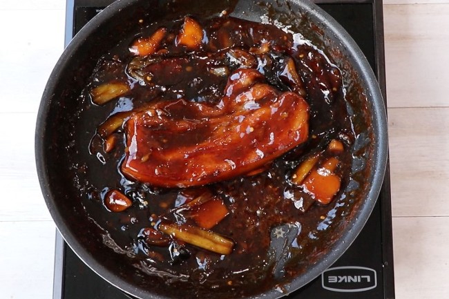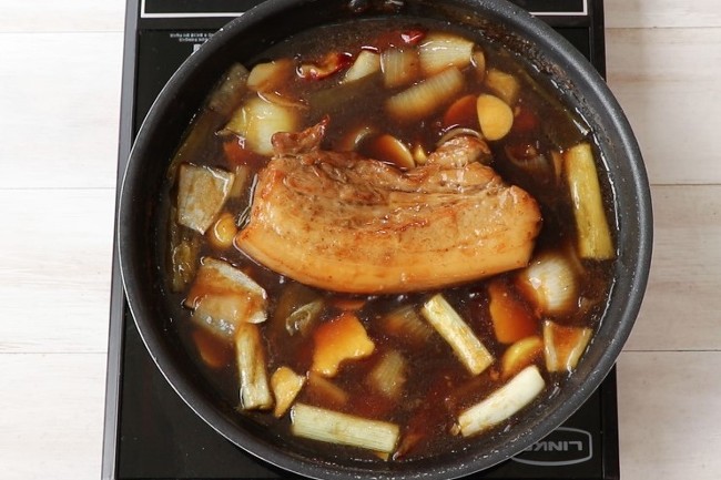 3. 조림 양념이 끓으면 구운 통삼겹살을 넣고 조린다.