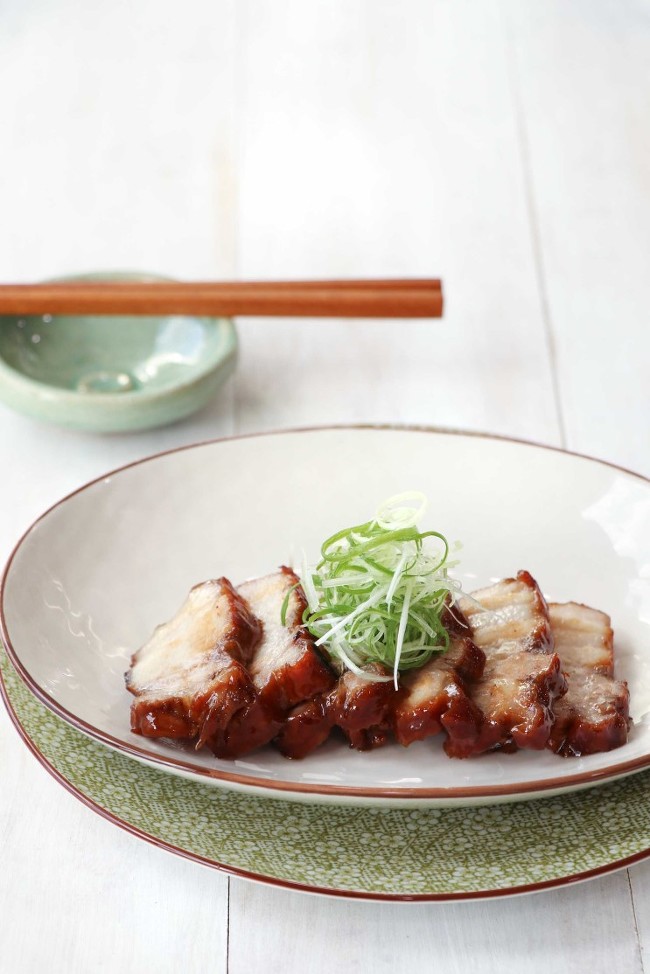 5. 접시에 졸인 통삼겹살을 썰어서 담고 채 썬 대파를 올린다.