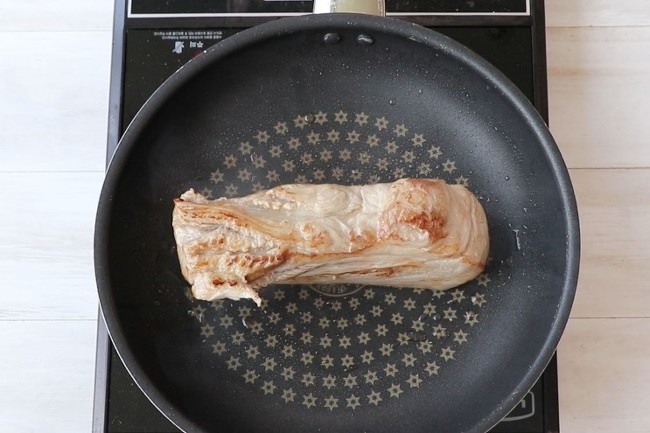 1. 달군 프라이팬에 통삼겹살을 센 불에서 노릇하게 굽는다.