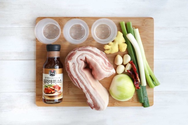 통삼겹살 300g, 양파 ½개, 대파 2대, 마늘 4톨, 생강 1톨 (40g), 건고추 2개,