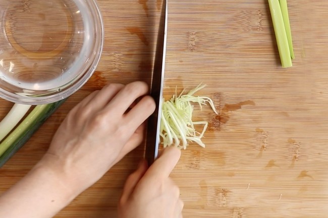 4. 대파는 얇게 채썬 뒤 찬물에 담가 둔 다음 물기를 제거한다.