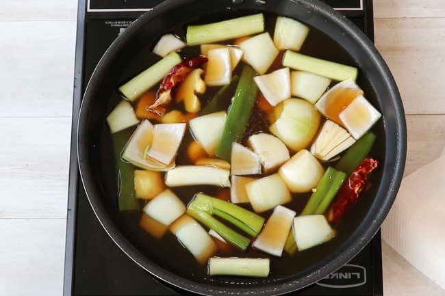 2. 데리야끼소스, 물, 청주, 간장, 양파, 대파(1대), 마늘, 생강, 건고추를 넣고 끓인다.