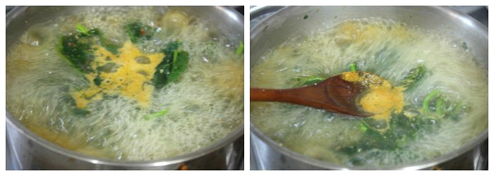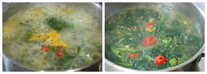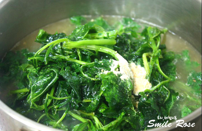 팔팔 끓은 육수에 치대어 헹구어 놓은 아욱을 넣고 마늘가루를 넣어서 팔팔 끓여줍니다~~~