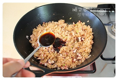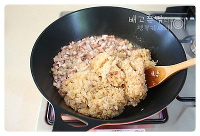 오징어가 완전히 익으면 밥 2공기를 넣고 고르 섞어 주면서 볶아 줍니다.