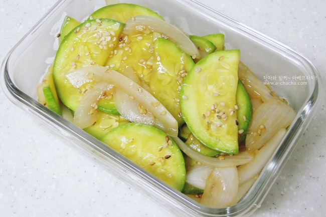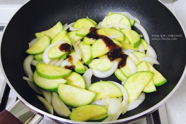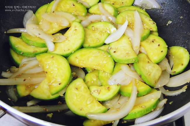 애호박 2/3개, 양파 반개, 굴소스 1스푼, 참기름 반스푼, 통깨 약간