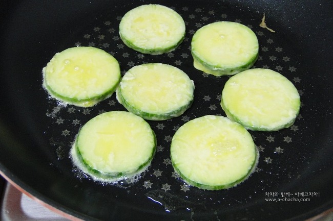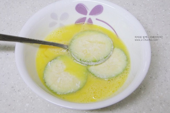 여기에 부침가루 묻힌 애호박을 넣어 계란옷 입혀준 후