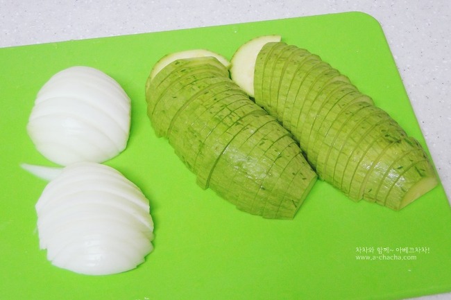 애호박은 반썰어준 후 반달모양으로 썰어주시고