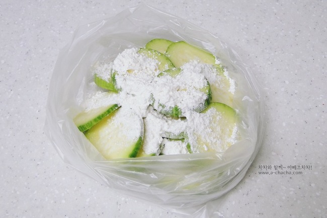 썰어둔 호박을 위생팩에 담고 부침가루 한스푼 넣고
