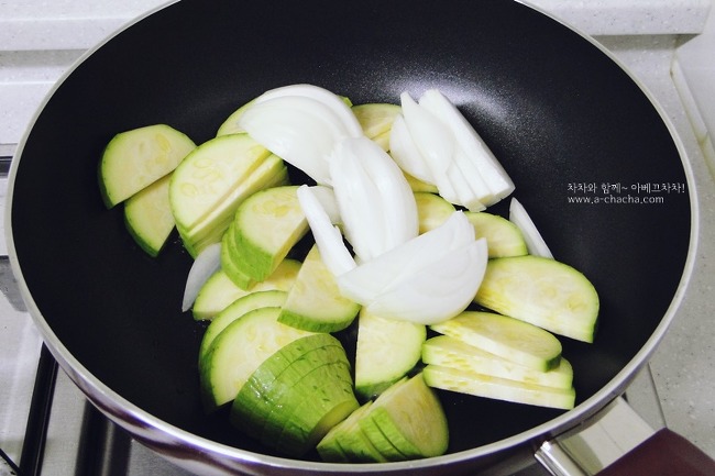 애호박과 양파를 함께 넣은 후 양파 끝이 살짝 투명해질 때까지 볶아주시다가~