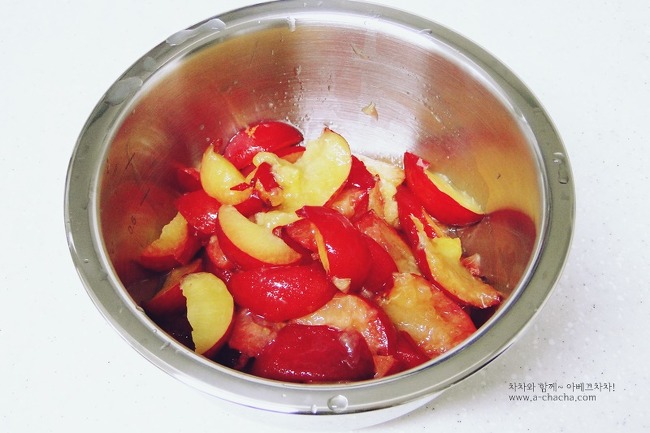 자두 과육에 설탕을 넣어 섞어주고 30분간 재워주세요.