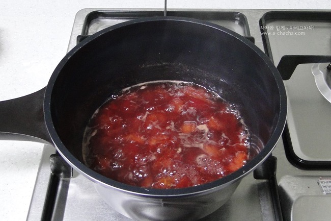거품을 걷은 뒤 타지 않도록 저어가며 끓여주세요.