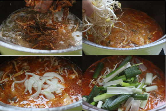 끓기 시작하면 콩나물과 양파를 넣어 뚜꺼을 열고 푹 끓여줍니다.