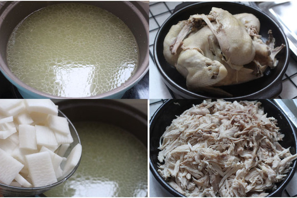 닭을 건져줍니다. 무도 나박하게 썰어 우러나온