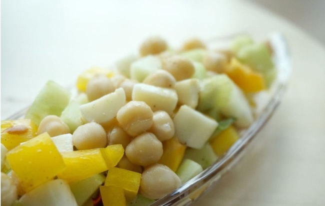④ 삶은 병아리콩을 건져 찬물에 헹군 후 물기를 빼서 썰어놓은 야채와 함께!