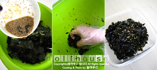 김을 꼭꼭 주물러가며 김에 간장이 골고루 잘 베이도록 뭉쳐주듯 주무릅니다...