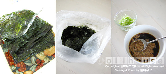 가끔 밑반찬이 마땅치않을때 김을 구워서 참기름 띄운 간장과 함께 내놓을때가 있어요...