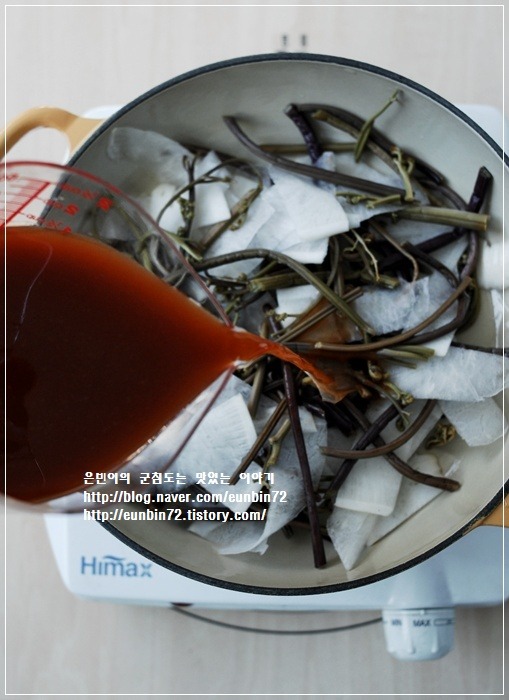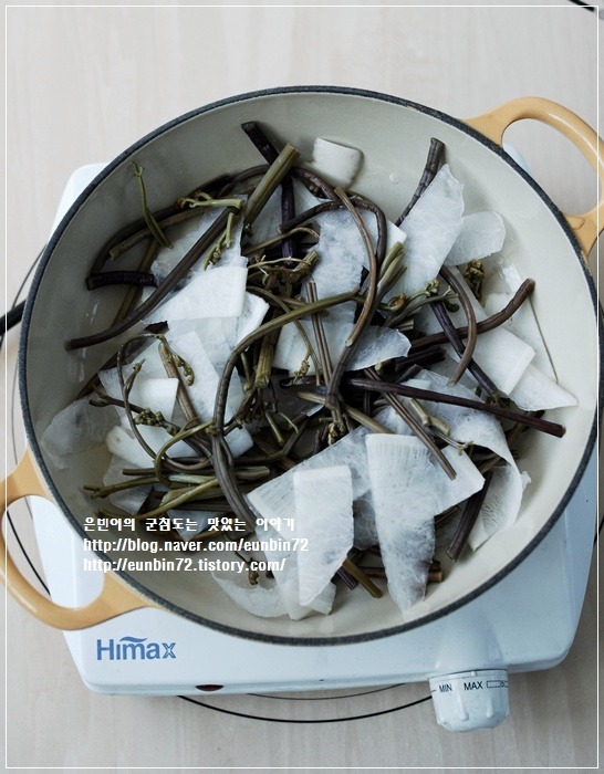 냄비에 불러둔 고사리와 무를 섞어 깔아주시구요