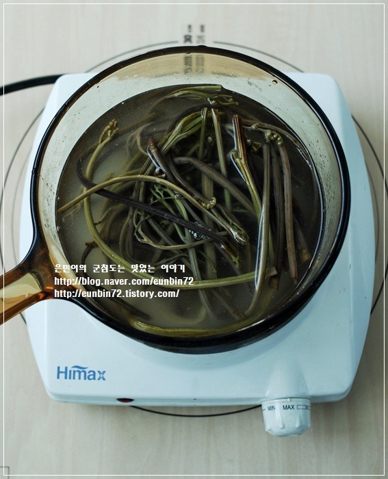 찬물에 말린 고사리를 넣고 줄기가 무를때까지 삶아주세요