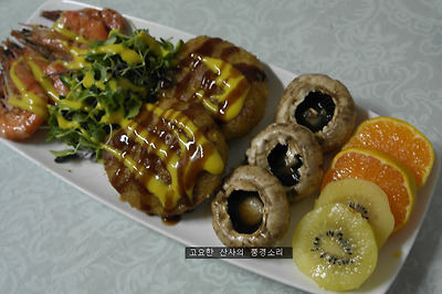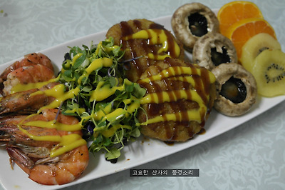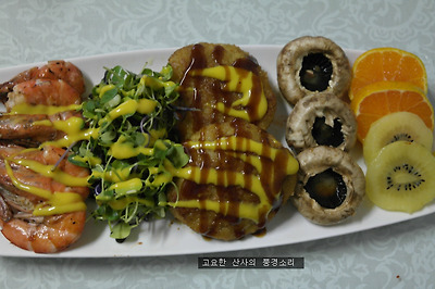 ▶ 재료 : 멘츠까스 2개, 새우 5마리, 양송이버섯 3개, 귤, 키위, 여린 채소, 소금, 머스터드소스 약간