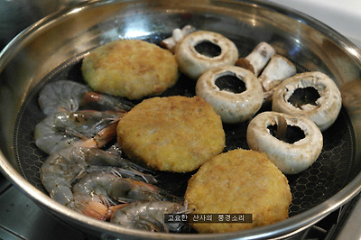 ㉠ 손질한 새우, 멘츠까스, 양송이버섯을 올려 구워낸다.