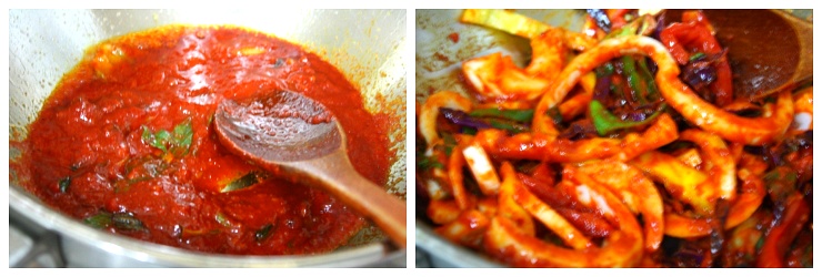 만들어 놓은 양념장을 넣고 볶아주다가 야채를 넣고 볶아줍니다~!~