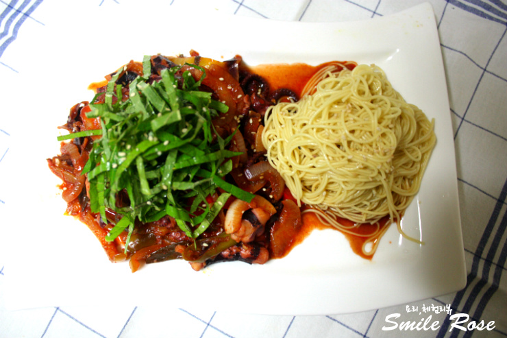 낙지 담은 접시 옆에 소면을 올려주었어요~!~