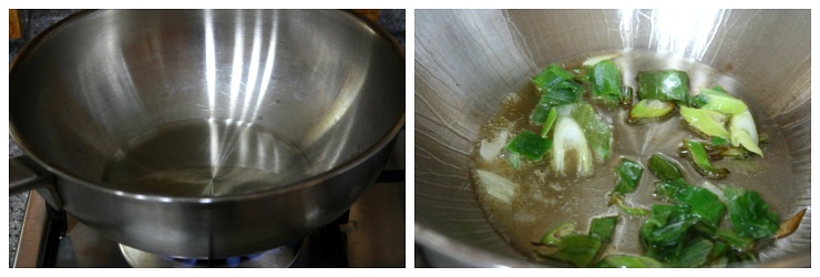 고추기름을 1 큰 술 넣고 다진 마늘과 대파를 넣고 볶아줍니다~~