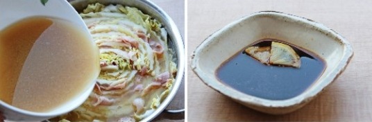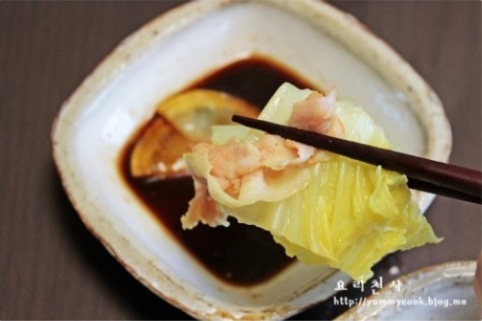 배추를 베이컨과 함께 건져내어 폰즈소스에 찍어 먹는다