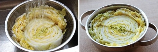 냄비 속에 있는 배추 위에 붓는다