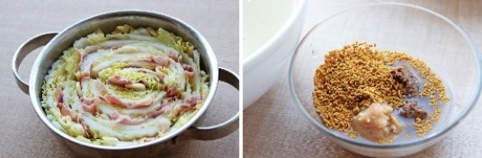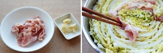 배추 사이사이에 베이컨과 슬라이스한 마늘을 끼워넣는다