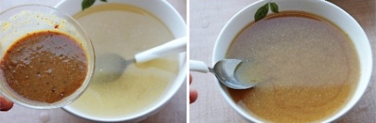 국물재료를 개어 다시마물에 섞고, 국간장 약간으로 간을 맞춰