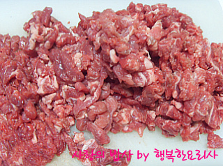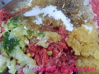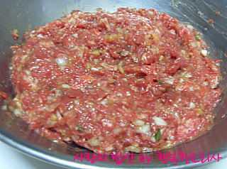4. 곱게 다진 갈빗살에 양념 재료를 넣고 치댄다.