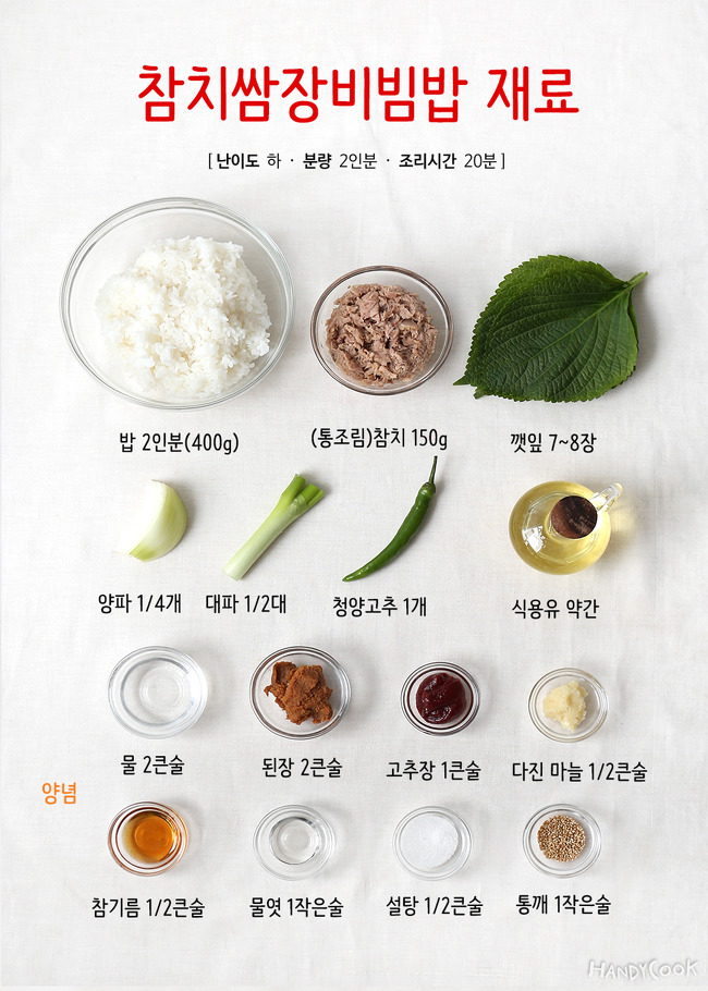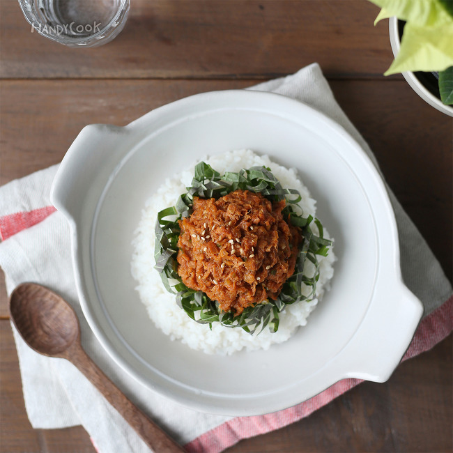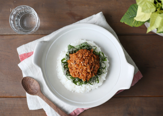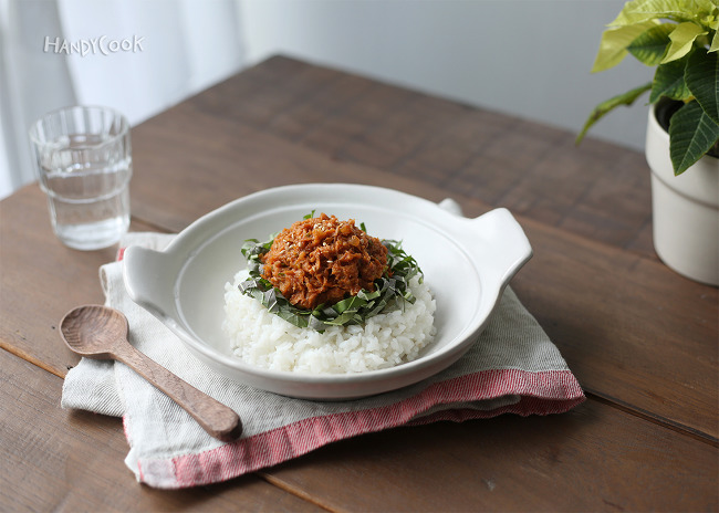 6. 그릇에 밥을 담고 깻잎을 담은 뒤 가운데에 참치쌈장을 올려 완성한다.